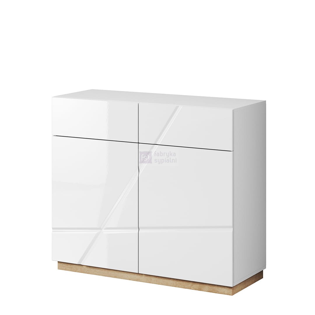 Oryginalna komoda do nowoczesnej sypialni z dwojgiem drzwi oraz dwiema pojemnymi i łatwo dostępnymi szufladami na bieliznę lub drobiazgi. Jej wnętrze skrywa ogrom miejsca do przechowywania dzięki czemu komoda sprawdzi się nie tylko w sypialni, ale również w salonie lub w przedpokoju.