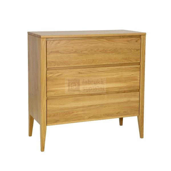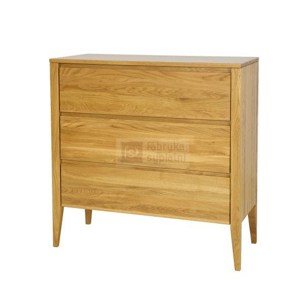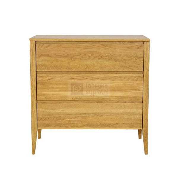 Dębowa komoda KD337 to jeden z tych mebli, który przyciąga wzrok już od progu. Jest połączeniem nowoczesności z nutą stylu vintage. Prostą, masywną bryłę mebla osadzono na wysokich nóżkach, co dodało lekkości całej konstrukcji. Piękne dębowe fronty szuflad zdobią subtelne, wycięte w drewnie uchwyty, tworzące nowoczesny system otwierania i zamykania. Całości dopełnia duży, drewniany blat, który posłuży do eksponowania rodzinnych zdjęć lub pamiątek.
