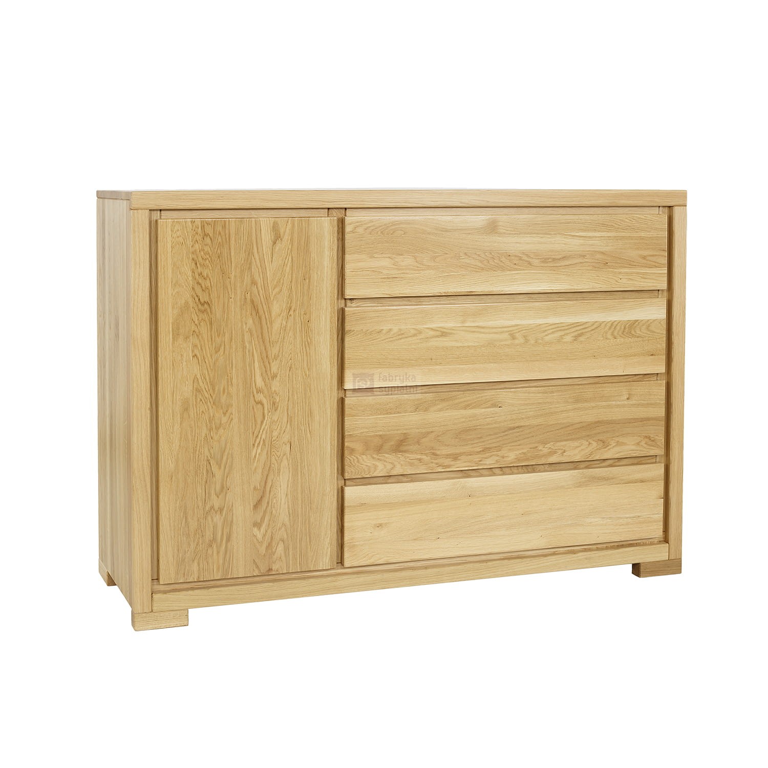 Komoda KD358 wykonana z drewna dębowego,to idealne rozwiązanie dla osób, które poszukują pojemnego mebla, zaprojektowanego w klasycznym, prostym stylu. Komoda posiada trzy szuflady oraz jedną szafkę, w których z łatwością przechowasz potrzebne rzeczy. Bezuchwytowe fronty komody to jeden z najmodniejszych trendów w meblach. Naturalna kolorystyka drewna dębowego oraz modny design komody idealnie wpasuje się w klasyczną aranżację wnętrz w Twoim domu.