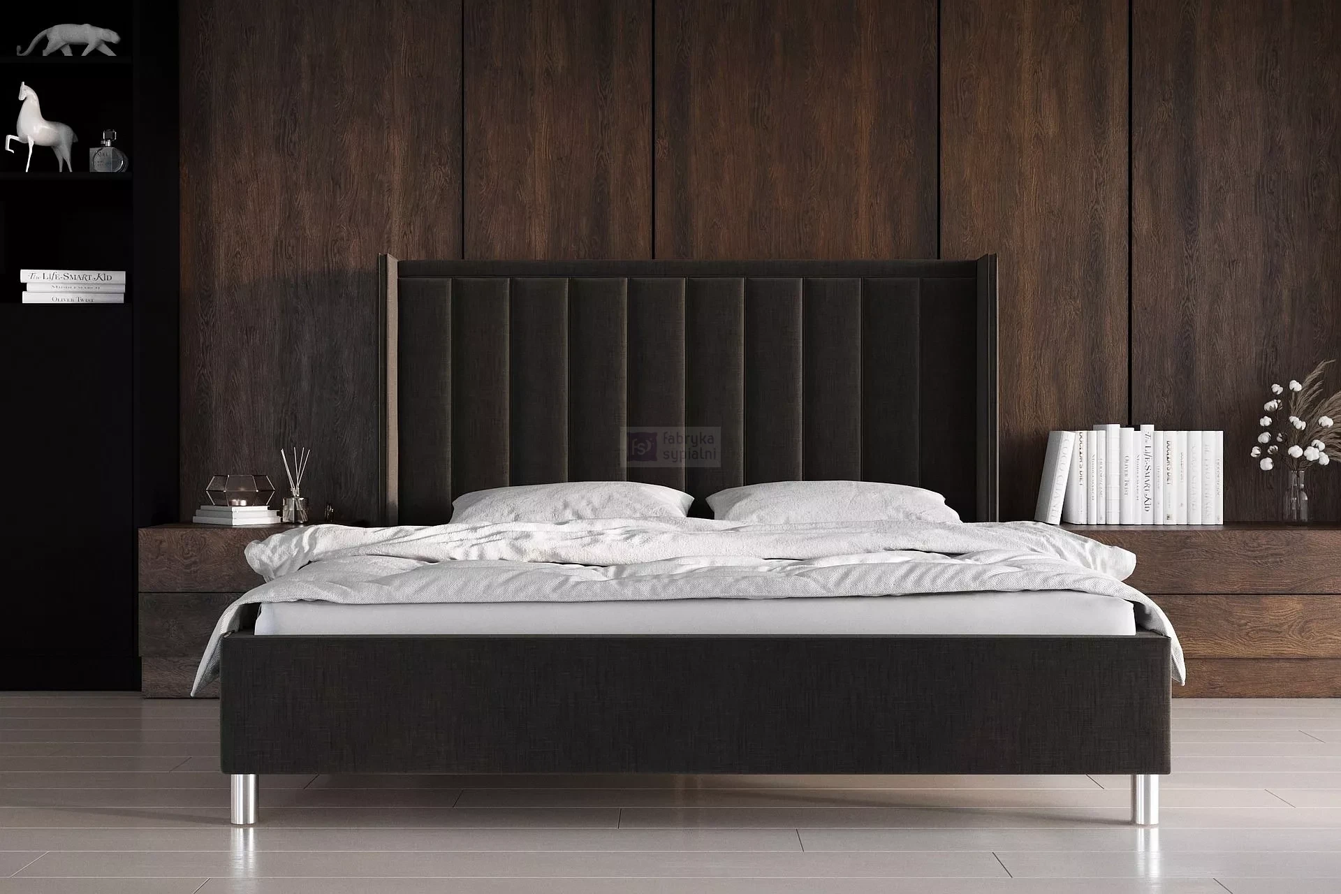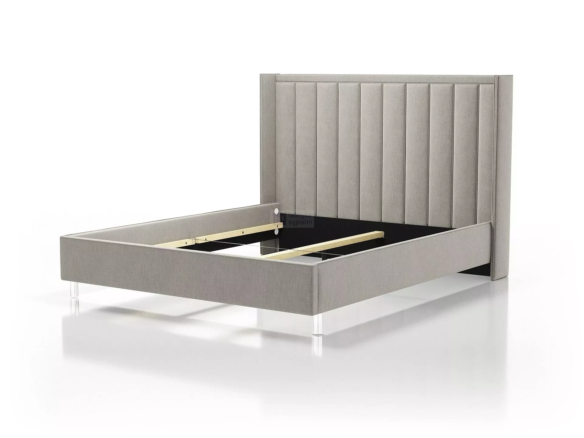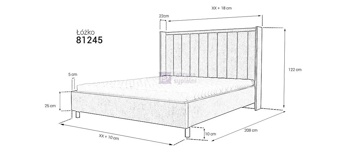 Nowoczesne, tapicerowane łóżko, którego wytworny styl doda charakteru każdej sypialni. Prostą ramę zwieńcza wysoki zagłówek w formie pionowych paneli, symetrycznie obramowanych. Konstrukcja łóżka wykonana jest z płyty, a na zewnątrz obita jest tkaniną meblową w szerokiej gamie kolorystycznej. Mebel stoi stabilnie na okrągłych, chromowanych, plastikowych nogach. Poza standardowymi wymiarami, łóżko jest dostępne również w nietypowej długości i szerokości. Za dodatkową opłatą zagłówek można otapicerować w tylnej części. Dla uzyskania pełnego zadowolenia klienta zalecamy odpowiedni stelaż i materac z naszej oferty.