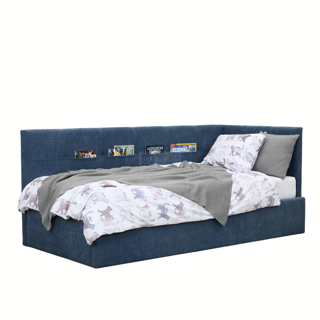 Łóżko tapicerowane Gio tworzy osłonięty kąt dzięki wezgłowiu od strony głowy i ściany, a wbudowane kieszonki mieszczą komiksy, tablet czy notatki.