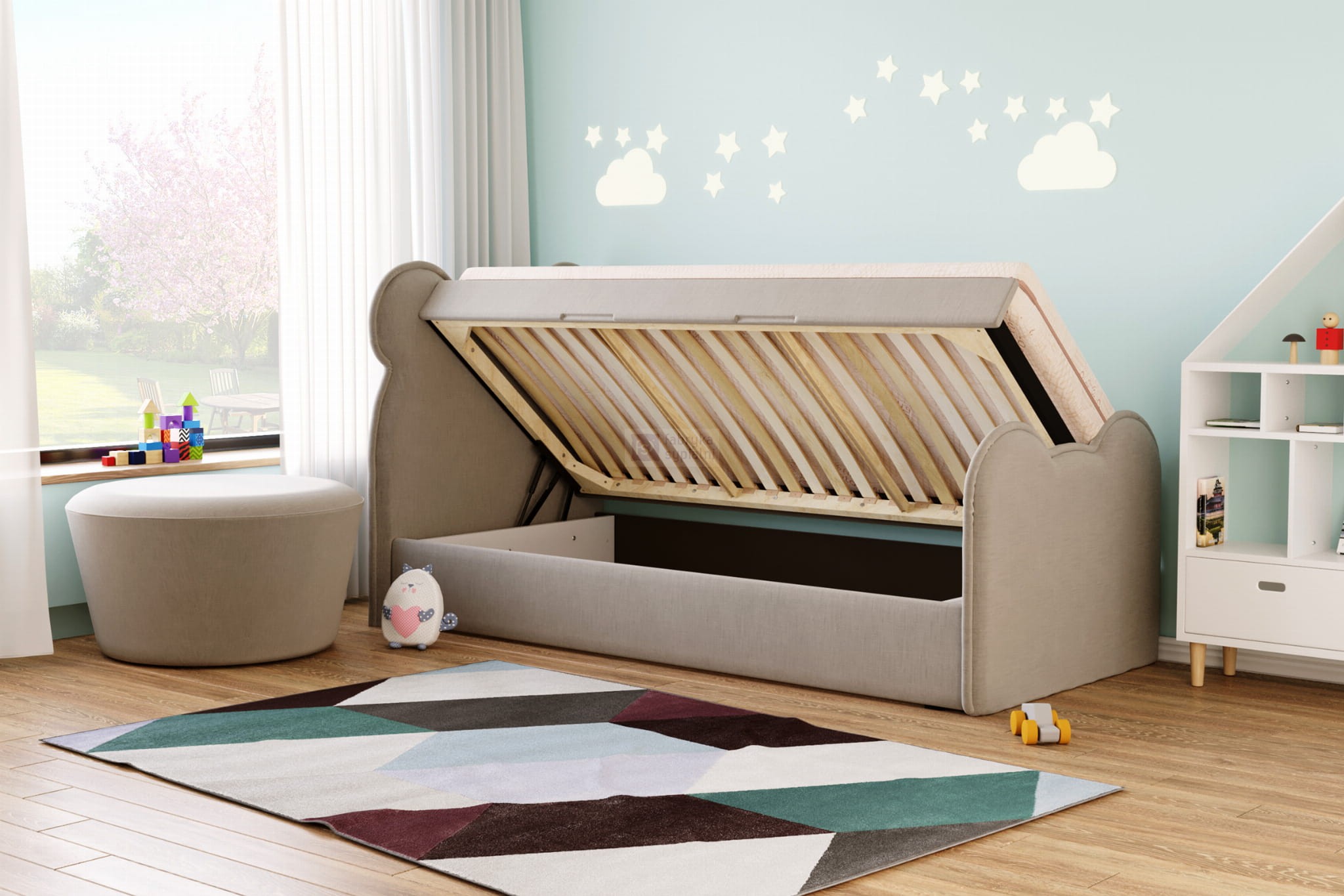 Dziecięce łóżko tapicerowane, składające się z prostej, ale solidnej ramy oraz uroczego zagłówka i zanóżka w kształcie sympatycznego misia,