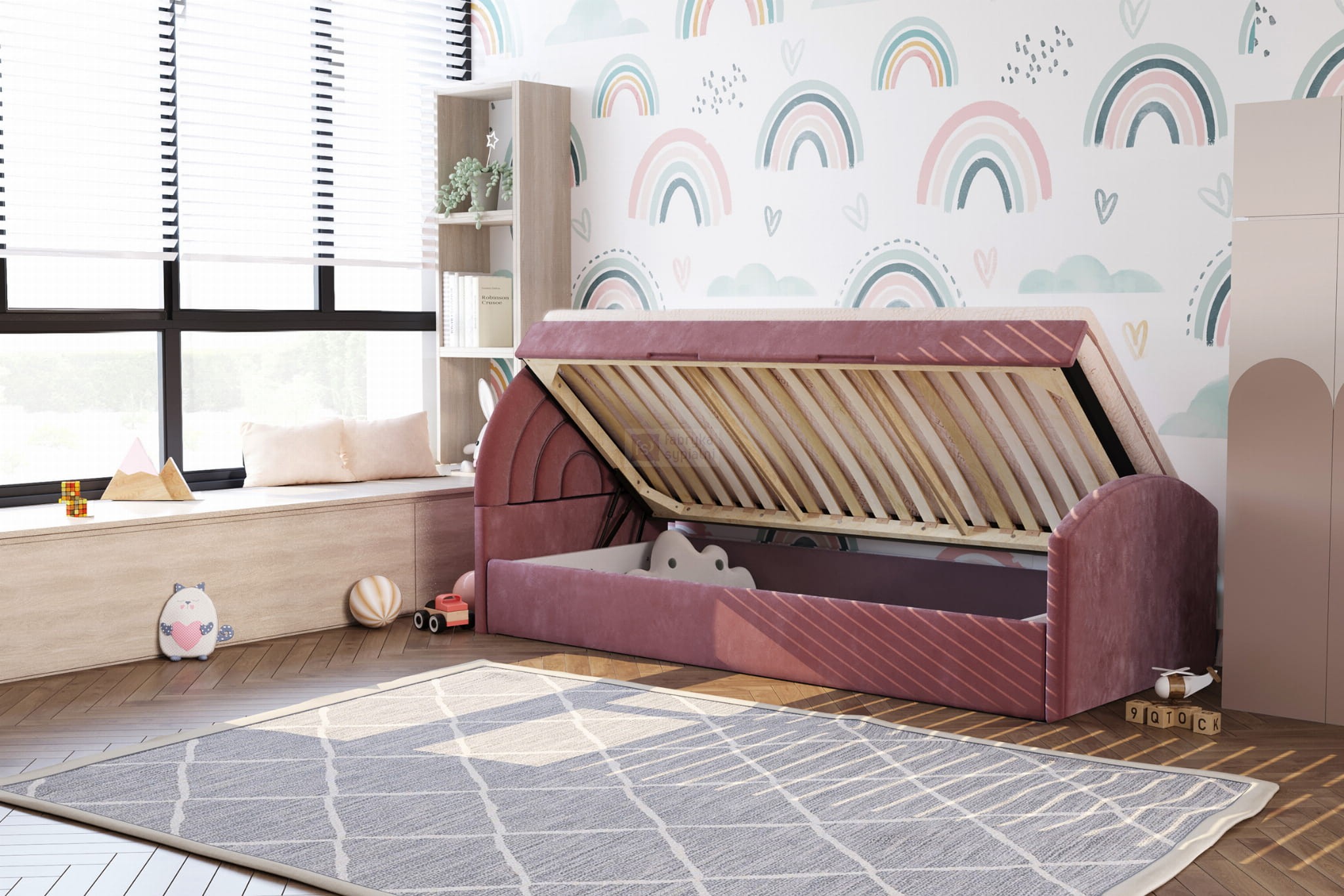 Dziecięce łóżko tapicerowane, składające się z prostej, ale solidnej ramy, uroczego zagłówka w kształcie tęczy oraz zanóżka,
