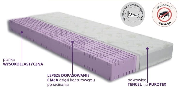 Materac jest nieco twardszą wersją poprzednika. Zbudowany jest z jednolitego bloku pianki wysokoelastycznej. Pianka ta została ponacinana konturowo. Pozwala to materacowi lepiej się dopasować i podeprzeć Twoje ciało.