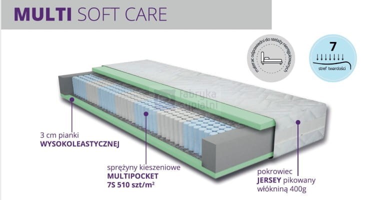 bóle kręgosłupa. Podobnie jak w przypadku pozostałych materacy kieszeniowych z naszej kolekcji sprężyny materaca Multi Soft Care zostały wykonane z wysokiej jakości drutu. Wkład obłożono obustronnie filcem oraz 3 cm pianki wysokoelastycznej. Zapobiegnie to odczuciu nacisku zwrotnego sprężyn.