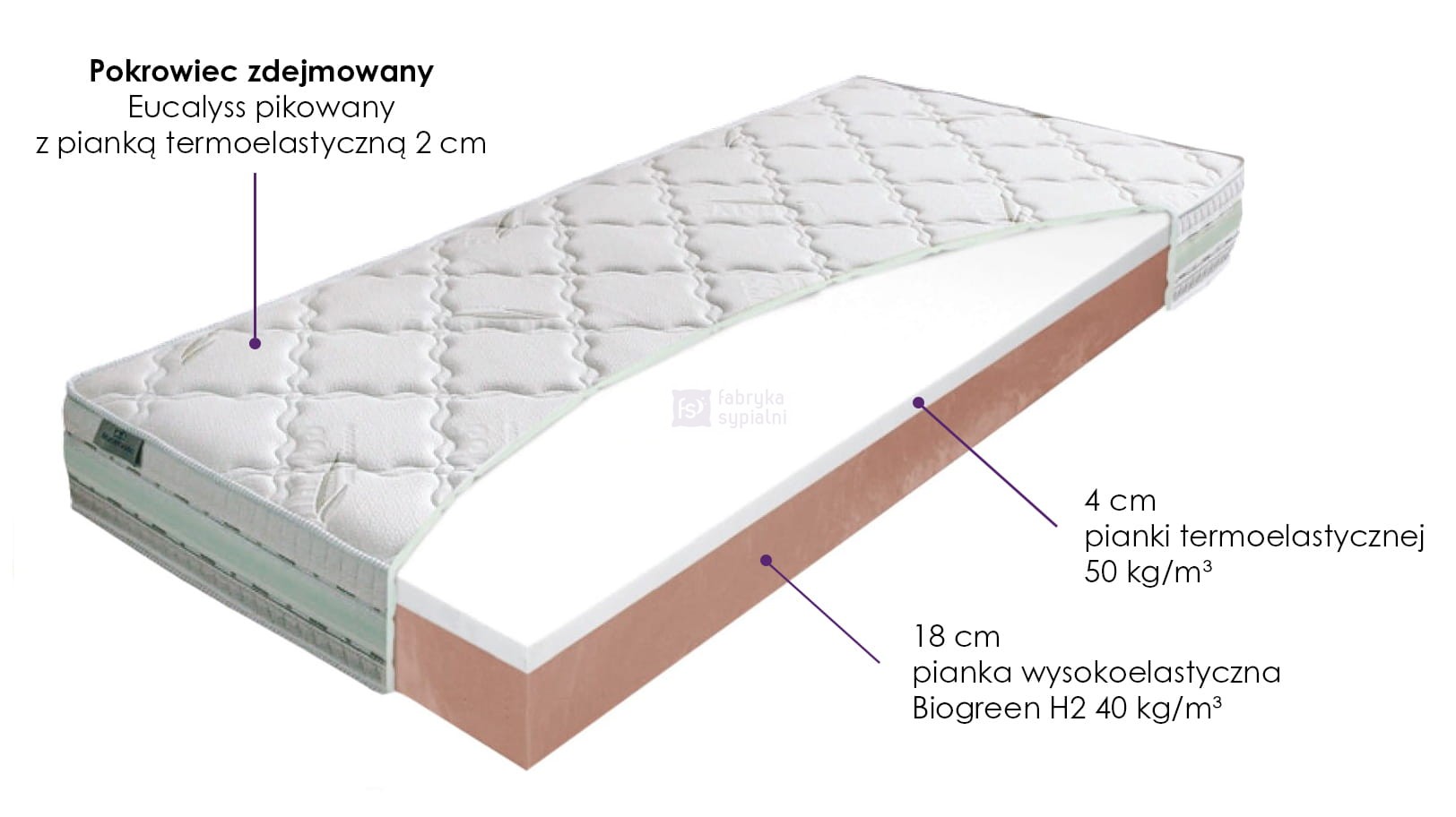 Doskonały materiał termoelastyczny, którego wysoka warstwa (4 cm) stanowi górną, komfortową warstwę materaca, zapewnia ergonomiczne podparcie ciała dzięki szybkiej adaptacji do naturalnych krzywizn ciała. Odciążony kręgosłup, odpowiednio odżywiony płynem rdzeniowym jest dzięki temu zregenerowany i gotowy do całodziennych działań.