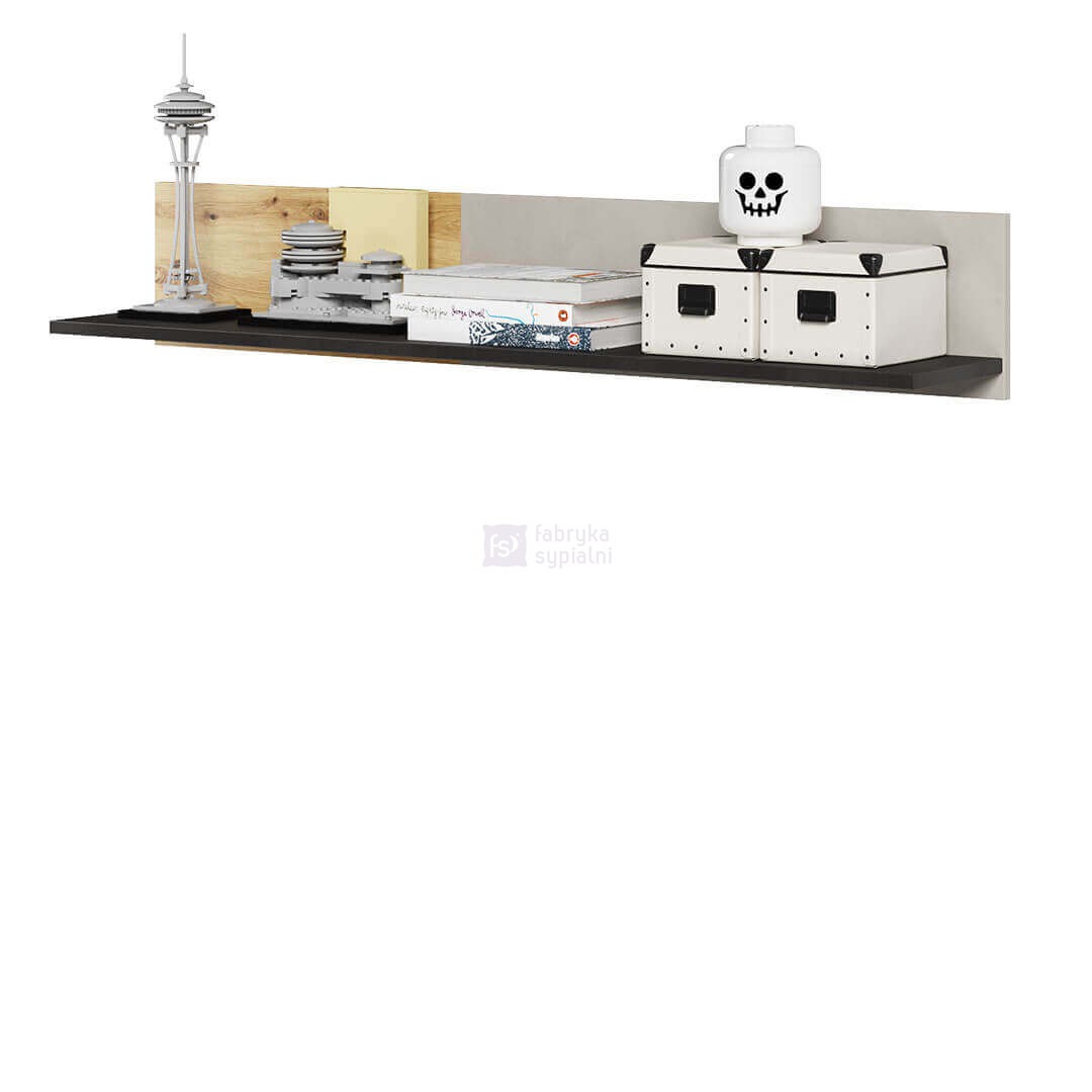 Półkę wykonano z wykorzystaniem trzech kolorów – jasnej szarości oraz dekorów o barwie drewna i surowej stali, dzięki czemu zyskała ciekawy, nowoczesny charakter.