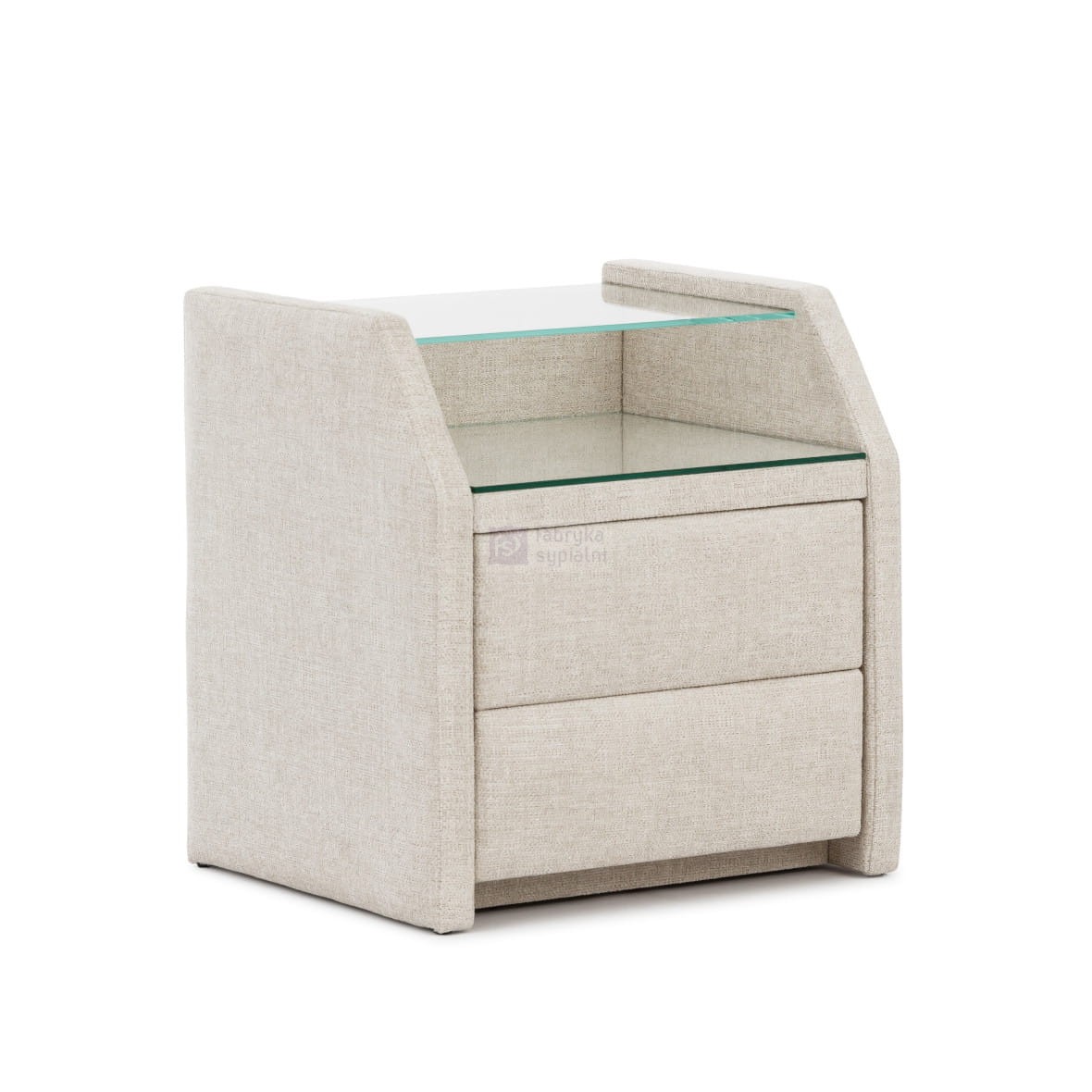 Praktyczny, wysoki, tapicerowany stolik (szafka nocna) z dwoma szufladami, szklanym przezroczystym blatem i i wygodną półką pomiędzy nimi.