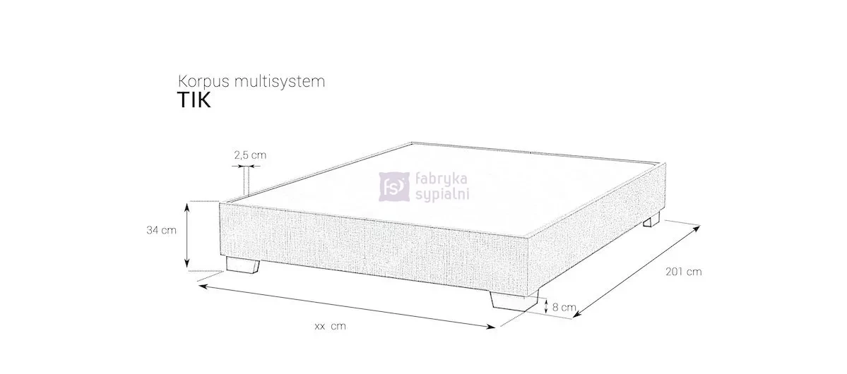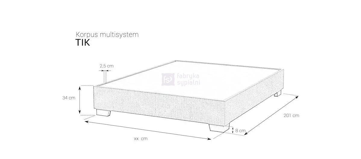 Konstrukcja łóżka opiera się na solidnym korpusie. Korpus TIK ze stelażem drewnianym w materiale tapicerskim na siłownikach gazowych oraz z pojemnikiem na pościel stanowi samodzielne łóżko lub jest podstawą do zamontowania zagłówka, z którym stworzy Multisystem według projektu klienta. Występuje w bogatej ofercie tkanin obiciowych. Wymaga skompletowania z wybranym rodzajem materaca M&K foam. Możliwość zamówienia korpusu na ślizgaczach, pod nóżki lub wyposażenia go w efektowne nóżki z jednego z zestawów dedykowanych do tego korpusu. Za dodatkową opłatą istnieje możliwość zamówienia korpusu o nietypowej długości i szerokości. Od szerokości 120 cm korpus składa się z dwóch części.